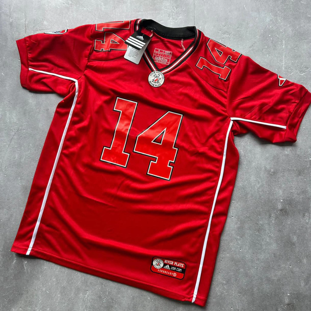 Casacas estilo NFL de River Plate en color rojo y con el numero 14.